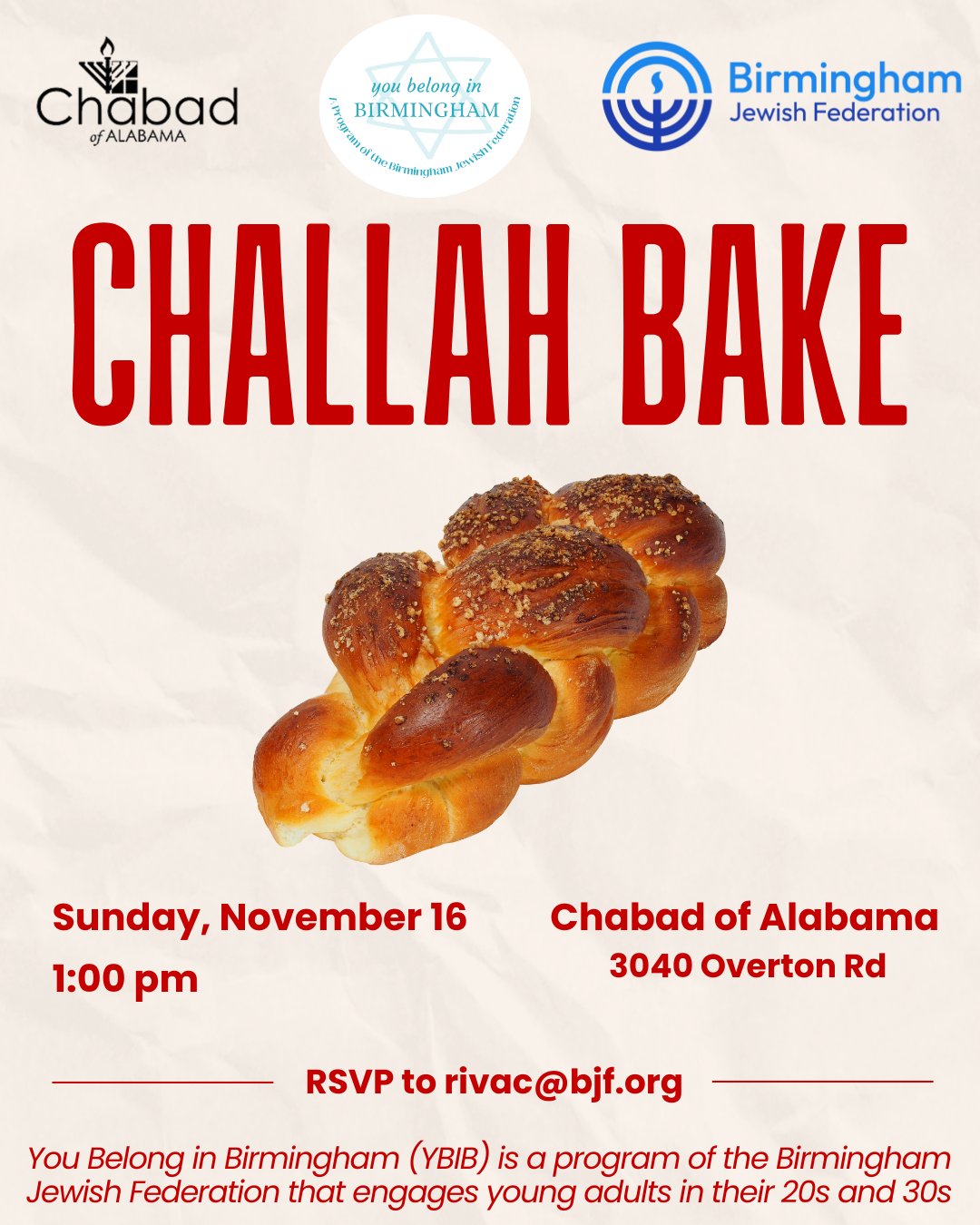 You Belong in Birmingham is hosting a Challah bake with Chabad of Alabama! Come braid, bake, and socialize!