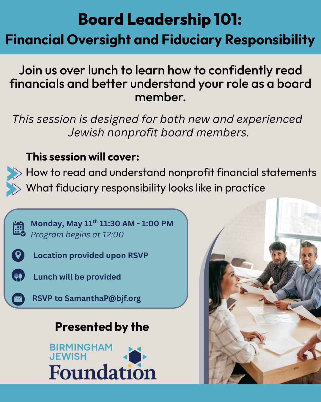 Presented by the Birmingham Jewish Foudation. Join us over lunch to learn how to confidently read financials and better understand your role as a board member. Location provided upon RSVP to samanthap@bjf.org