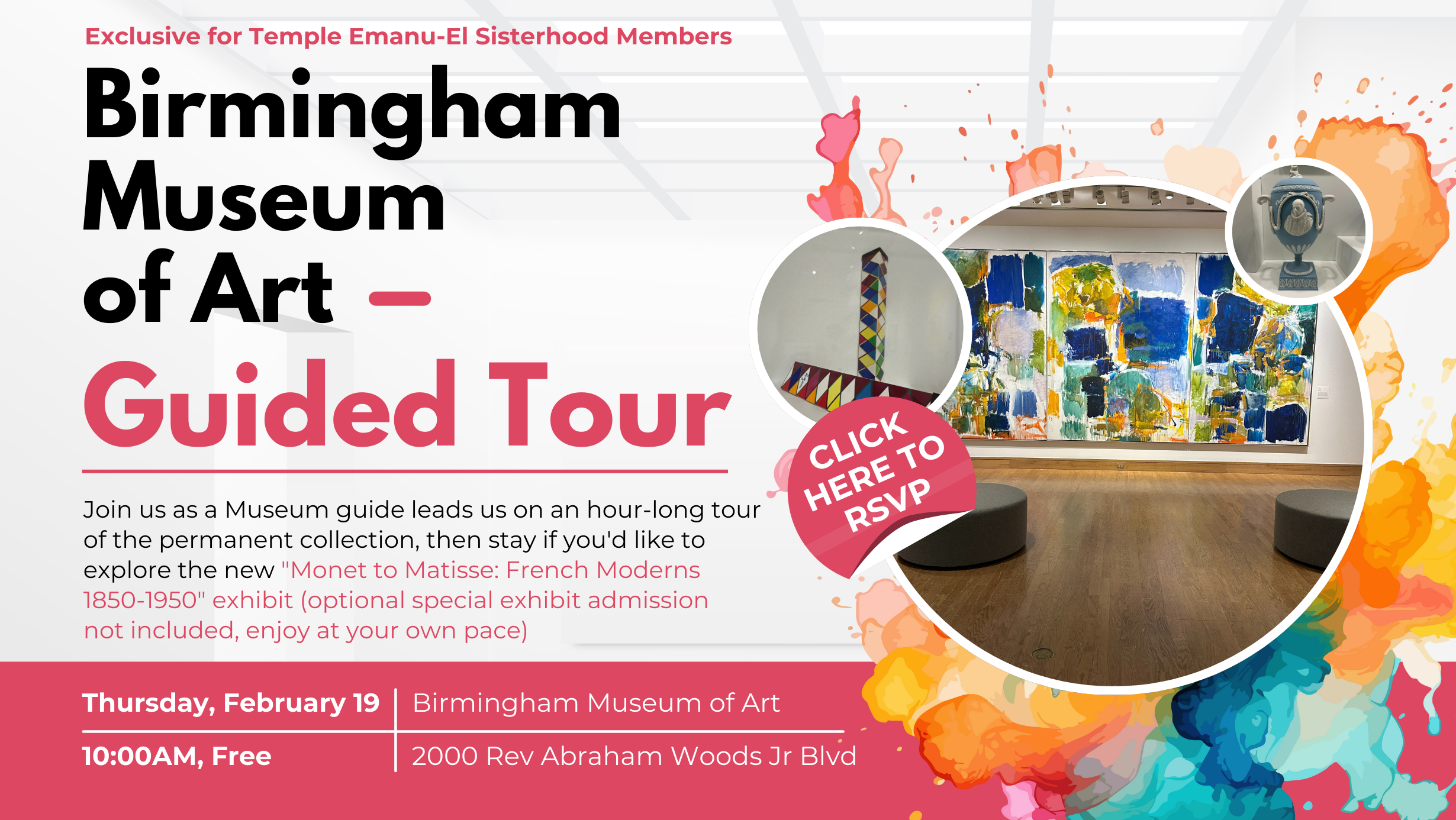 Sisterhood exclusive: Join us Thursday, February 19 at 10am for a free guided tour of the Birmingham Museum of Art's permanent collection. Afterward, you're welcome to visit the new "Monet to Matisse: French Moderns 1850-1950" exhibit at your own pace by purchasing a ticket.