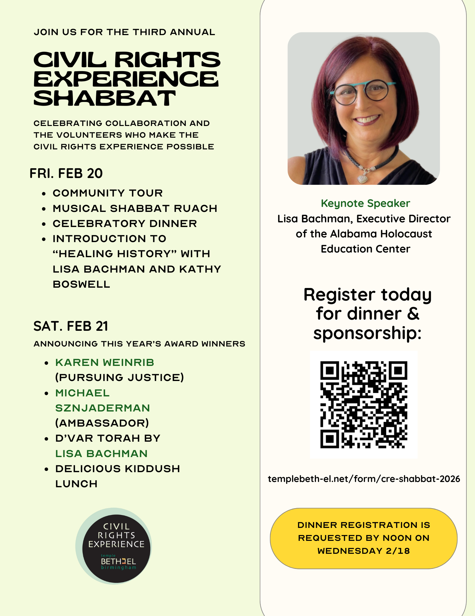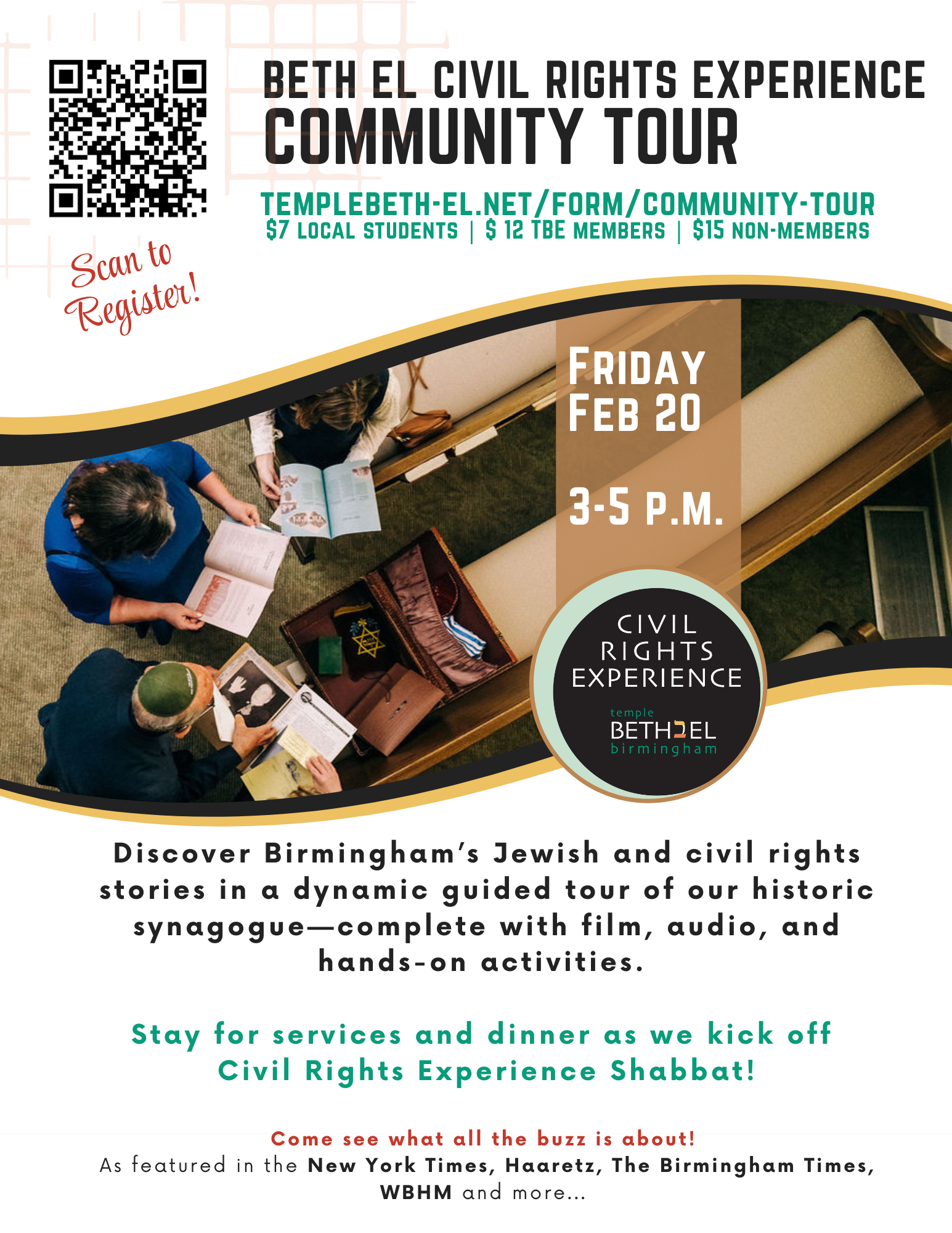 Discover Birmingham’s Jewish and civil rights stories in a dynamic guided tour of our historic synagogue—complete with film, audio, and hands-on activities. Stay for services and dinner as we kick off Civil Rights Experience Shabbat! Come see what all the buzz is about! As featured in the New York Times, Haaretz, The Birmingham Times, WBHM and more...